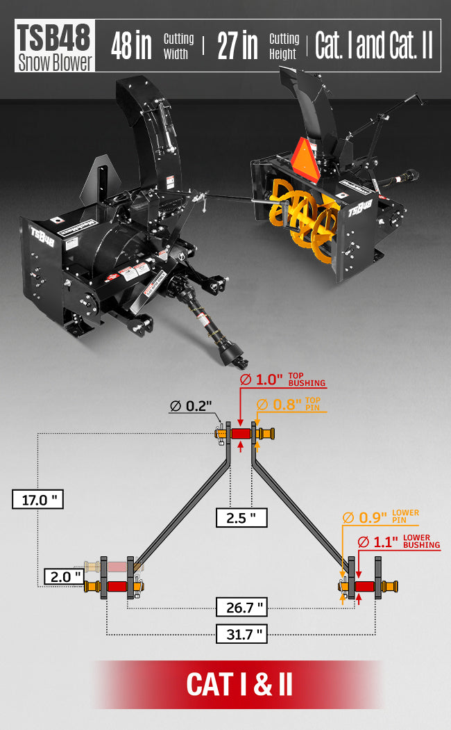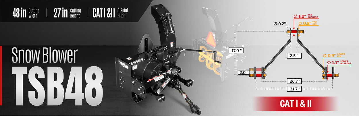 48" 3 Point PTO Snow Blower 24" Impeller Diameter 360° Snow Chute (PTO Shaft Included with Slip Clutch), 20-45 HP, TSB48