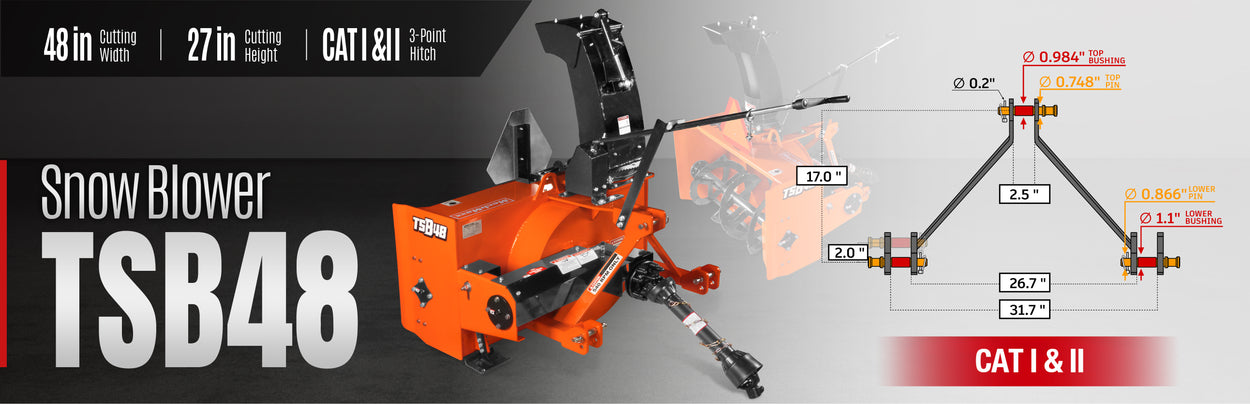 48" 3 Point PTO Snow Blower 24" Impeller Diameter 360° Snow Chute (PTO Shaft Included with Slip Clutch), 20-45 HP, TSB48T