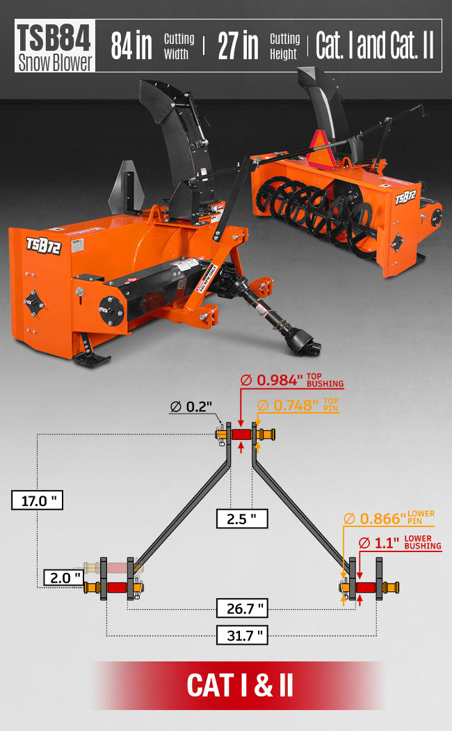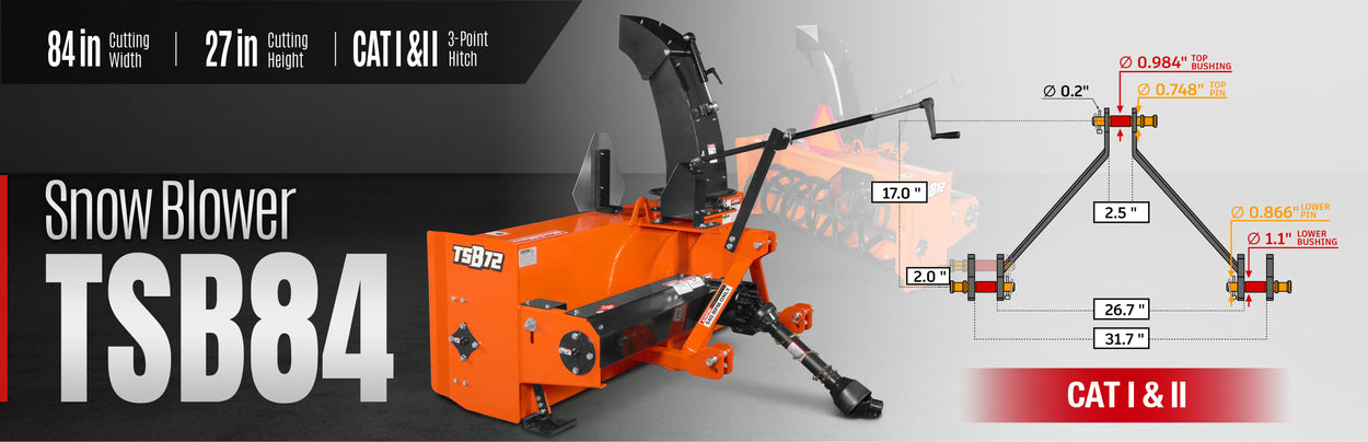 84" 3 Point PTO Snow Blower 24" Impeller Diameter 360° Snow Chute (PTO Shaft Included with Slip Clutch), 35-95 HP, TSB84T