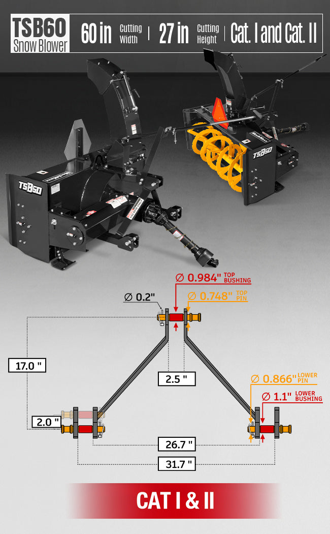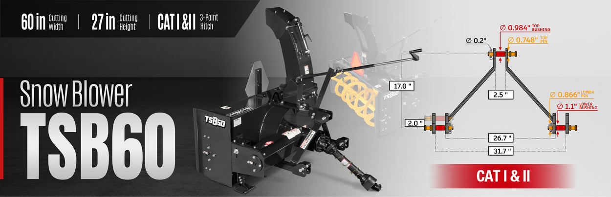 60" 3 Point PTO Snow Blower 24" Impeller Diameter 360° Snow Chute (PTO Shaft Included with Slip Clutch), 25-65 HP, TSB60